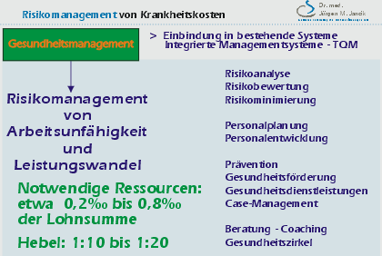 Das Humankapital war für die unternehmerischen Führungsaufgaben bisher eher von nachrangiger Bedeutung. Arbeitnehmer wurden in den Unternehmen beschäftigt, wenn sie kompetent, ausreichend gesund, leistungsfähig und leistungsbereit waren, um ihre Arbeitsaufgaben regelmäßig erfüllen zu können; Ersatz für leistungsgewandelte Arbeitnehmer war am Arbeitsmarkt in ausreichender Anzahl vorhanden. Entsprechend den erkennbaren Veränderungen im demografischen Aufbau der Bevölkerung und nachfolgend auch am Arbeitsmarkt, wird in den Unternehmen zunehmend deutlich, dass aus dem allgemeinen Arbeitsmarkt heraus zukünftig nur begrenzt der betriebliche Bedarf an kompetenten, leistungsfähigen und leistungsgewillten Mitarbeitern gedeckt werden kann. Um die Betriebe vital und leistungsfähig zu erhalten, ist zukünftig ein gezieltes Risikomanagement zur Sicherung des vorhandenen Humankapitals notwendig.
